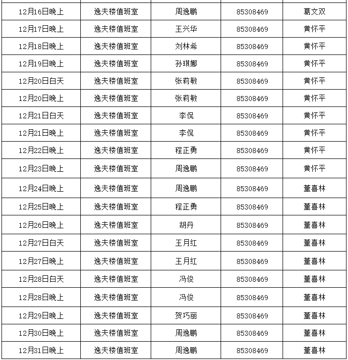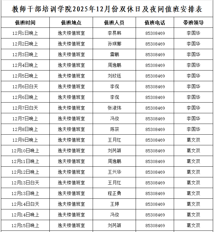 教师干部培训学院2025年12月份双休日及夜间值班安排表