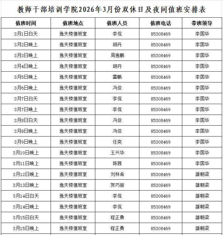 教师干部培训学院2026年3月份双休日及夜间值班安排表