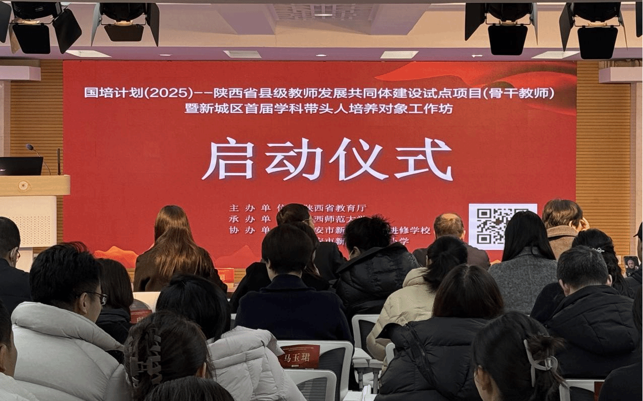1月15日下午,“国培计划(2025)——陕西省县级教师发展共同体建设试点项目(骨干教师)暨新城区首届学科带头人培养对象工作坊启动仪式”在新知小学举行。西安市新城区教育局党委副书记田峻、教师进修学校副校长(主持工作)刘婷、新知小学教育集团总校长刘岚、全国模范教师、国务院政府特殊津贴专家郗莉、我院副院长葛文双以及新城区教育局、教师进修学校相关负责人、指导专家、青年骨干教师及其工作坊成员400人参加开班仪式。仪式由新城进校副校长周晓星主持。